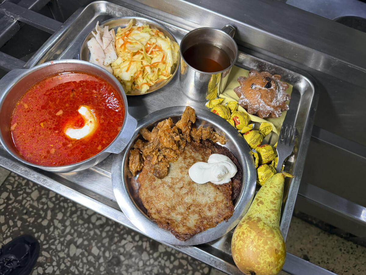 А мы продолжаем охотиться на «Профессиональный обед», и сразу после теста столовой на базе МЧС мы записались на обед в Войсковую часть 5448 ВВ МВД РБ. С улицы сюда нельзя попасть (через забор, но только один раз), поэтому вдвойне интересно протестить, чем кормят спецназ, а те кто служил, проверит на честность. Интересный факт: среди солдат проводят конкурс на лучшие блюда, и те, кто побеждают, получают письменную благодарность и полезные солдатские бонусы. Сразу после увлекательной экскурсии мы отправились в местную столовую, по традиции через подтягивание на турнике (для солдат). Каждая среда - день белорусской кухни, только кто служил, знает об этой традиции. На табло блюда и кто за них отвечает с фото на память. В армии за обед уже уплочено, беру металлический поднос и выдвигаюсь на линию раздачи. Выбора нет, обед продуман, размер обеденных калорий просчитан - 1400 на человека: арахис, 6 конфет, борщ, салат, сало, драники с поджаркой, хлеб, кекс и груша. Последний раз видел столько
