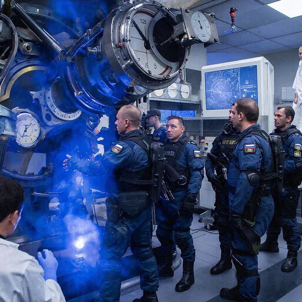 Группа российских спецназовцев стояла перед таинственным устройством, похожим на гигантские часы с множеством циферблатов и рычагов. Это была экспериментальная машина перемещения в параллельные миры, созданная группой учёных, работавших над проектом «Хронос».