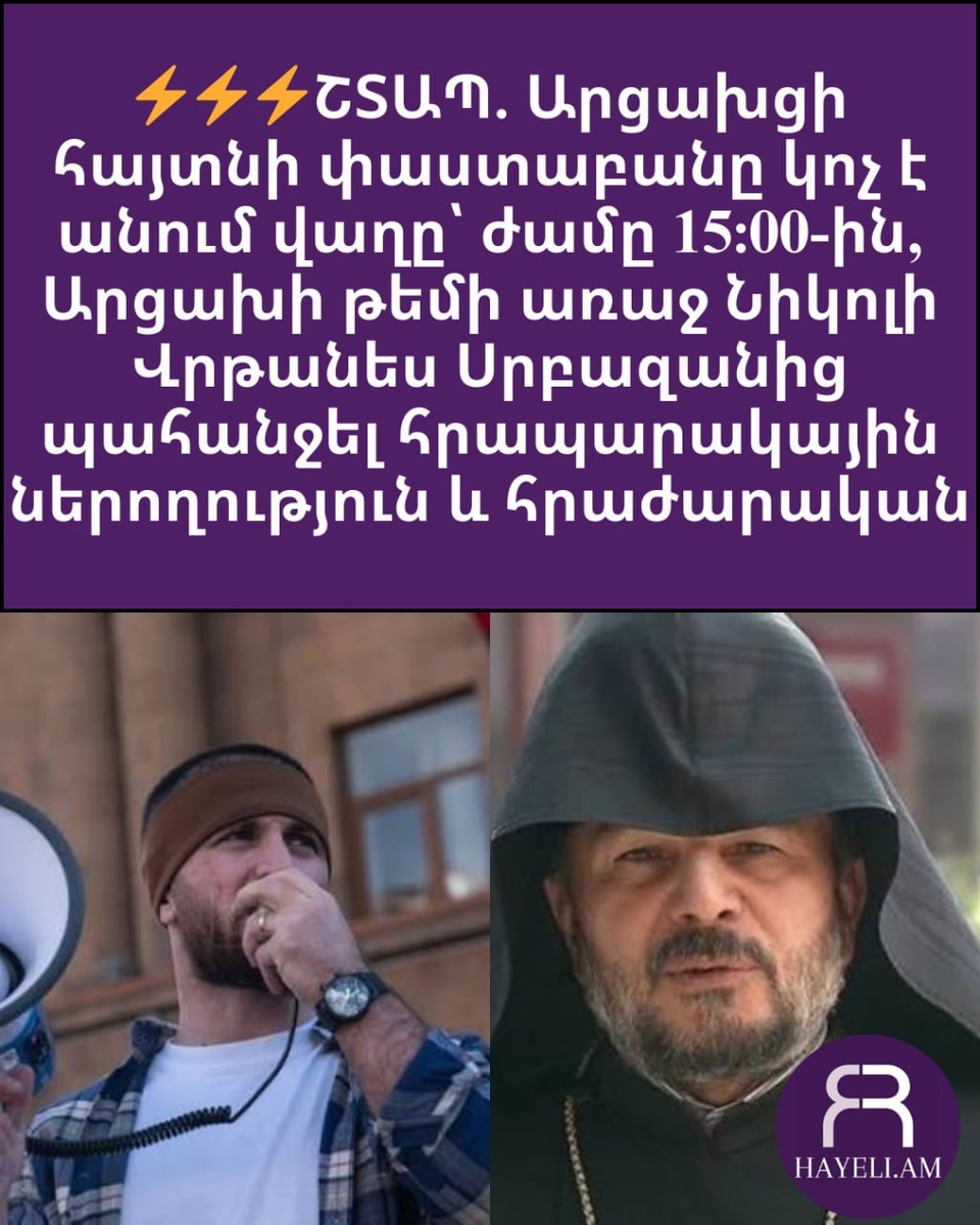 ⚡️⚡️⚡️ ՇՏԱՊ. Արցախցի հայտնի փաստաբանը կոչ է անում վաղը՝ ժամը 15:00-ին, Արցախի թեմի առաջ Նիկոլի Վրթանես Սրբազանից պահանջել հրապարակային ներողություն և հրաժարական #ՏԱՐԱԾԻՐ «Վաղը՝ ժամը 15:00-ին առաջարկում եմ բոլորիդ սպասում եմ ՀԱԵ Արցախի թեմի առաջնորդարանի դիմաց (ք․ Երևան, Այգեձորի փող., 53բ) Վրթանես Սրբազանից պահանջել հրապարակային ներողություն՝ Արցախը Ադրբեջանի կազմում ճանաչած իշխանությանը հարգանքի արժանացնելու, հայկական սրբությունները պղծության հանձնողին պատվելու և մեր ժողովրդի ցավը անտեսելու համար»․ Փաստաբան Ռոման Երիցյան