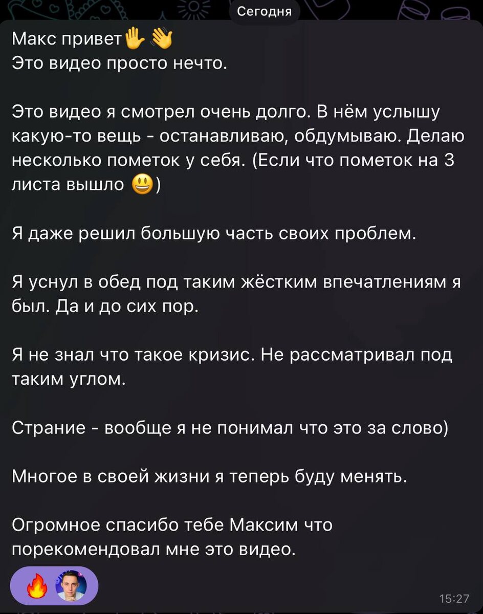 💪🏼 У меня есть формат личной работы с людьми. И замечаю у одного ученика упадок сил, мотивации, настроя, отсутствие блеска в глазах…. Я понимаю, что все инструменты которые я могу ему дать, не будут исполнены в том виде, в том формате, с тем рвением и с тем результатом, который мне нужен. 🤌 Я чувствовал, что прежде чем идти в слой работы под названием инструменты (товар, конверсия, реклама), нужно поработать со слоем под названием 🧠 Ему я порекомендовал посмотреть особенное видео (не моё) Это видео вылечило меня в том году и как вы видите по сообщению, моего ученика тоже поставило на ноги. Это реальный отзыв, который я получил от ученика. 👆 Он прислал его после того, как я рекомендовал ему посмотреть именно это видео. Тот самый случай, когда информация не просто «интересная», а перезагружает мозг. Но тут нужно сказать и то, что он молодец, ведь подошел к процессу просмотра основательно. Он: ▶️ Останавливал запись, чтобы обдумать. ▶️ Сделал 3 листа пометок. ▶️ Решил большую