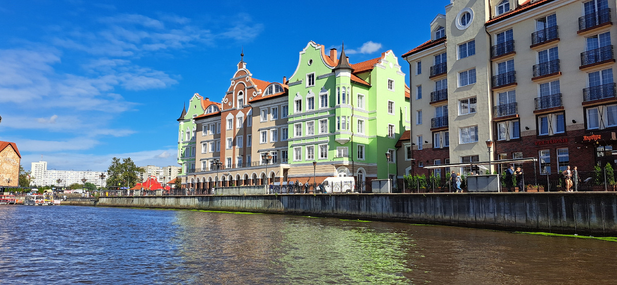 - Рыбная деревня, или «Маленькая Европа», — визитная карточка города. Это комплекс зданий в средневековом стиле фахверк, популярном в Германии. Построена она на набережной реки Преголя в 2005 году. Здесь много ресторанов, фуд-траков, торговых палаток, сувенирных лавок и несколько отелей. Это самое туристическое место в Калининграде. Здесь всегда много туристов, так как открываются шикарные панорамные виды с ресторанов, особенно со смотровой башни «Маяк» высотой 33 метра. В ней можно посидеть в ресторане с красивым видом или посетить музей стекла. С пристани на реке Преголя можно отправиться на катере в речной круиз продолжительностью около 45 минут. Цена — 1000 рублей.