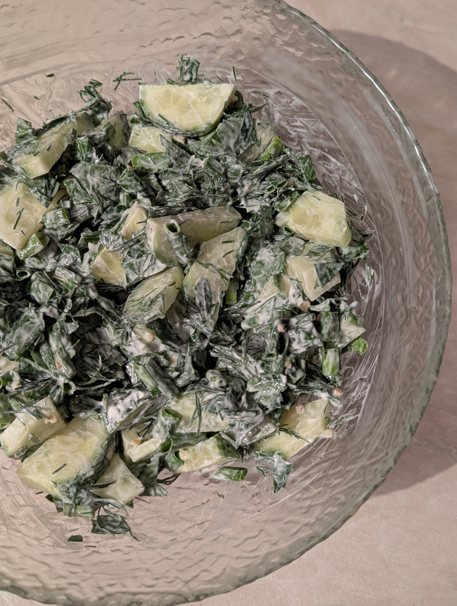 Ингредиенты: - Огурцы свежие – 2-3 шт. - Зеленый лук – 1 пучок - Укроп – 1 пучок - Петрушка – 1 пучок - Сметана или оливковое масло – по вкусу - Соль – по вкусу «Рекомендую добавить сушёный чеснок » 😉 Приготовление: 1. Огурцы тщательно вымойте и нарежьте тонкими кружочками или соломкой. 2. Зеленый лук, укроп и петрушку вымойте и мелко нарежьте. 3. Смешайте огурцы и зелень в салатнице. 4. Добавьте соль по вкусу. 5. Заправьте салат сметаной или оливковым маслом. Подача: Салат готов к подаче. Его можно украсить дополнительными веточками зелени или семенами кунжута для более интересного вкуса и внешнего вида. ❗Этот салат является отличным вариантом для правильного питания, так как он содержит много свежих овощей и зелени, а также полезные жиры из сметаны или оливкового масла.