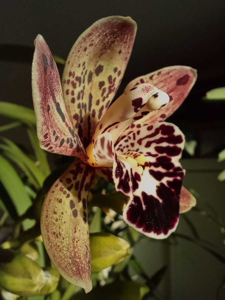 Волшебные обитатели моего зелëного царства: 🏰 Состоялось долгожданное знакомство с Цимбидиумом "Магия Фогеля" (Cymbidium Vogel's Magic) на три цветоноса. Скромник показал пока только один цветок из примерно 40. Приехал ко мне 8 марта с высохшими цветами, тогда знакомства не случилось (фото 1-3) ✨ Синяя Ванда из Ашана, купленная отцветом в начале лета, нарастила корни и расцвела фиолетовой, не осуждаю. Похоже садовники всë-же химичат (фото 4-6) 💜 Бульбофиллум длинноцветковый (Bulbophyllum longissimum) расцвëл нежно-персиковыми птичками, сидящими на ветке - как поэтично выразилась одна из моих цветочных фей. Выпустил розовых птичек прямиком ко дню моего рождения и неожиданно порадовал наиприятнейшим запахом свежей выпечки с нотками тропических фруктов. Что невероятно и удивительно, т.к. многие бульбаши не очень приятно и специфически пахнут, а мне повезло (фото 7-8) 🍀 На фото 9 Толумния адаптировалась в домашних условиях и греется в редких лучах Тюменского солнышка 🌝 Тепла нам Всем и
