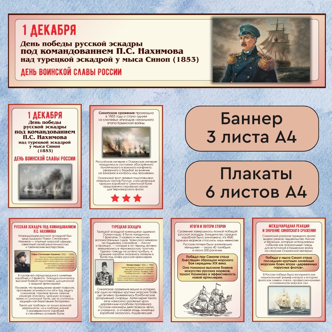 Оформление ко Дню победы русской эскадры под командованием П.С. Нахимова над турецкой эскадрой у мыса Синоп (1853 год) — комплект, который поможет создать атмосферу патриотического урока, вовлечь детей в изучение отечественной истории и подчеркнуть значимость одного из ключевых событий Крымской войны. Тема оформления — героическая победа в Синопском сражении, демонстрирующая выдающееся мастерство русских моряков и легендарное командование адмирала Нахимова. Готовое решение для учителей, классных руководителей, педагогов-организаторов и методистов — ничего не нужно придумывать, печатайте и размещайте. Высокая наглядность: крупные, чёткие изображения, легко читаемые тексты, исторически достоверные элементы. Единый стиль и аккуратный дизайн, который создаёт патриотическую атмосферу. Практичность: материалы подходят для классного часа, тематического урока и оформления школьного коридора, холла, выставочной зоны или музейного уголка. Укрепление интереса к истории — оформление помогает детя