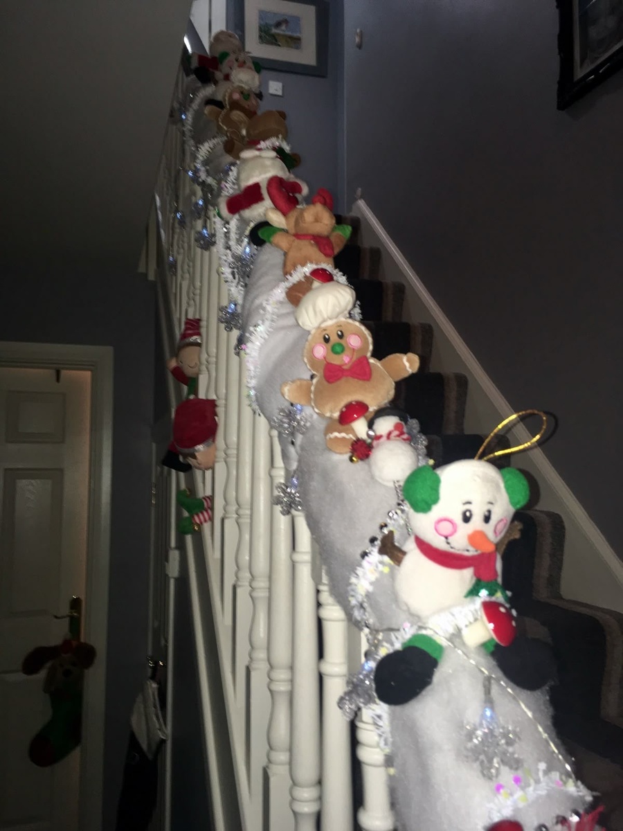 А что если… украсить лестницу? Как вам идея? Дорого? Белая простыня и немного ваты или синтепона сойдут за снег. А игрушки сейчас очень дёшево можно купить в Фикспрайсе или в гипермаркетах. Хотя, я за то, чтобы сделать самим или с семьей. Например, вот такие вот снеговички почти ничего не стоят. Упаковки проволоки хватит на очень много, а стоит она примерно 100 руб. Ну а набивку можно взять из старой подушки. Как вам идея?