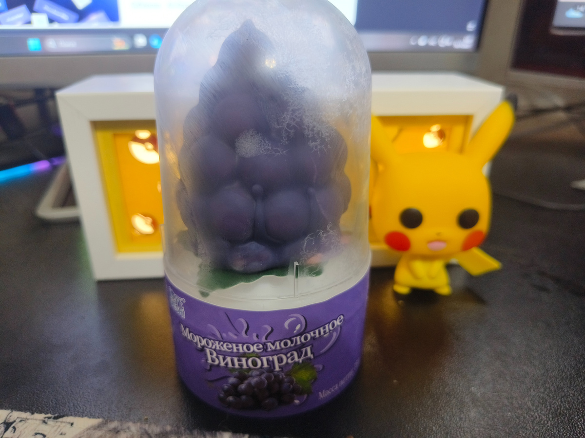 Всем дратути. И это опять мороженное из @samokat_15min. И тоже китайское как и "куриная голень" Мороженое Виноградик. Подача что то на уровне элитности. Мороженное видно под прозрачным куполом. И выглядит оно крайне красиво, и вот очень интересно, мороженное то вроде из китая, но на упаковке абсолютно всё на русском. Этикеточка фиолетовая, есть картинка винограда. и написан вес 75г. На обратной стороне тоже всё на русском,не ужели китайцы так постарались и заморочились для импорта? Тут у нас и состав, и КБЖУ, и производитель. Там где производитель видно слово "CHINA", всё верно мороженное с китая, но всё на русском. Да меня легко удивить таким, ведь обычно импортированные продукты маркируются отдельной наклейкой на русском языке, ну ладно. энергетическая ценность в 100г - 307 ккал (Хотя в самокате на стр. продукта указано 230 ккалорий) белки в 100г - 4 г (в приложении 3г) жиры в 100г - 20 г (в приложении 15г) углеводы в 100г - 27 г (в приложении 10) Какие то не состыковки. @samokat_15