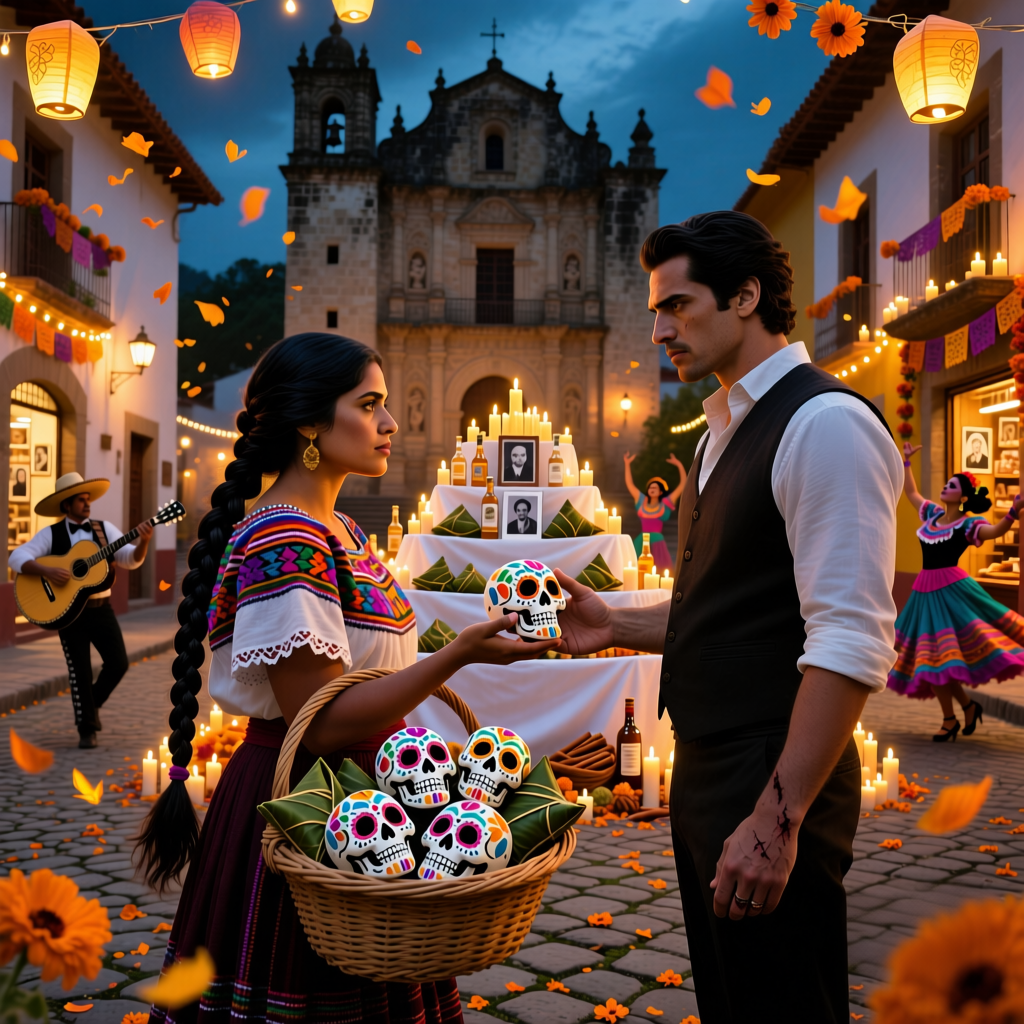 Мария Солис шла по главной улице, неся в руках корзину, полную сахарных черепов. Она была дочерью этой земли, ее кровь была смесью испанской и сапотекской, а душа насквозь пропиталась ее магией. Ее темные волосы, заплетенные в одну густую косу, пахли дымом и ванилью. Она помогала матери готовить алтарь для деда, и теперь ее задачей было разнести калаверас — эти сладкие, искусно расписанные символы смерти — друзьям и родственникам.