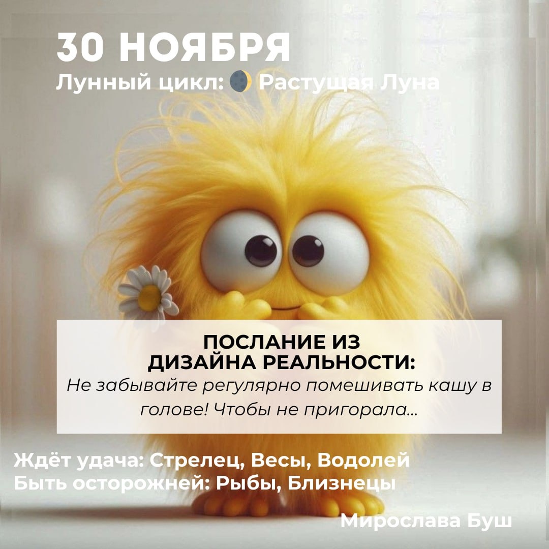 30 ноября РЕКОМЕНДАЦИИ: 🌈 Посмотрите на свои успехи за этот месяц… но под углом “я молодец не потому что сделал(а), а потому что выстоял(а)”. Похвалите себя абсолютно за каждое старание, будь то тренировки, чтение книг, усердная работа или активное участие в жизни детей. 📝 Сделайте маленький жест благодарности себе будущей. Напишите смешную записку и засуньте её в место, в которое планируете заглянуть только через несколько дней. Когда вы её найдёте — это точно подарит вам прекрасное настроение и зарядит энергией на волшебные дела. ✉ Подписаться на Мирославу