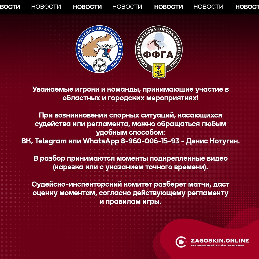 ⚽ Уважаемые игроки и команды, принимающие участие в областных и городских мероприятиях. При возникновении спорных ситуаций, касающихся судейства или регламента, можно обращаться любым удобным способом (ВК, Telegram или WhatsApp 8-960-006-15-93) Денис Котугин . ✂ В разбор принимаются моменты подкрепленные видео (нарезка или с указанием точного времени) ⚠ Судейско-инспекторский комитет разберет матчи, даст оценку моментам, согласно действующему регламенту и правилам игры. #zagoskin_online #ффга #футзал #перваялига #высшаялига #втораялига #третьялига #суперлига #кубокгорода #сезон25_26 #новости