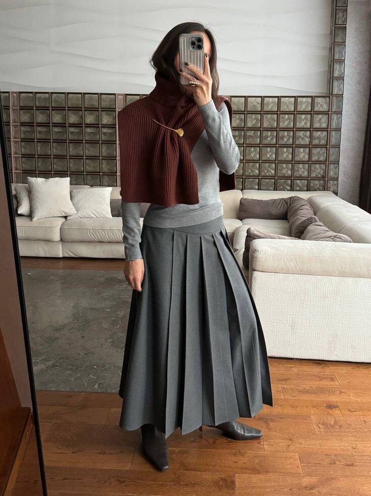 В прошлых сезонах мы носили юбки макси прямого силуэта, и вот настало время перемен. Этой зимой самой популярной стала юбка макси расклешённого кроя. Она обязательно должна быть выполнена из плотного материала и держать форму, а остальные детали на ваше усмотрение: крой на запах, крупные складки, асимметрия, высокий разрез — актуально всё. Мы такому возвращению расклешённой юбки очень рады, ведь она отлично корректирует пропорции: уравновешивает широкие плечи и пышную грудь, сглаживает изгибы бедра и визуально сужает талию.