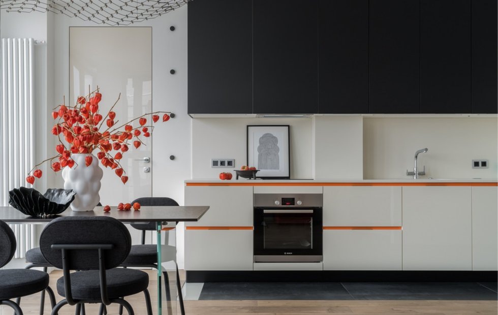 Кухонный гарнитур изготавливался на заказ. Верхние фасады выполнены в матовом черном цвете, нижний ярус решен в светлых глянцевых тонах, добавляющих ощущение легкости и простора. Оригинальным акцентом стала оранжевая линия, проходящая по фасаду нижних ящиков. Она разбавляет бежевый цвет и поддерживает общую цветовую гамму квартиры.