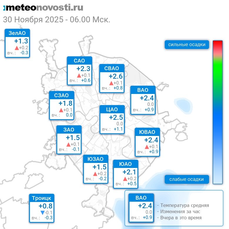 В 6:00 в Москве было от +0.7°C до +2.9°C, средняя температура +2.1°C #погода #Москва #осень #температура #30ноября #воскресенье