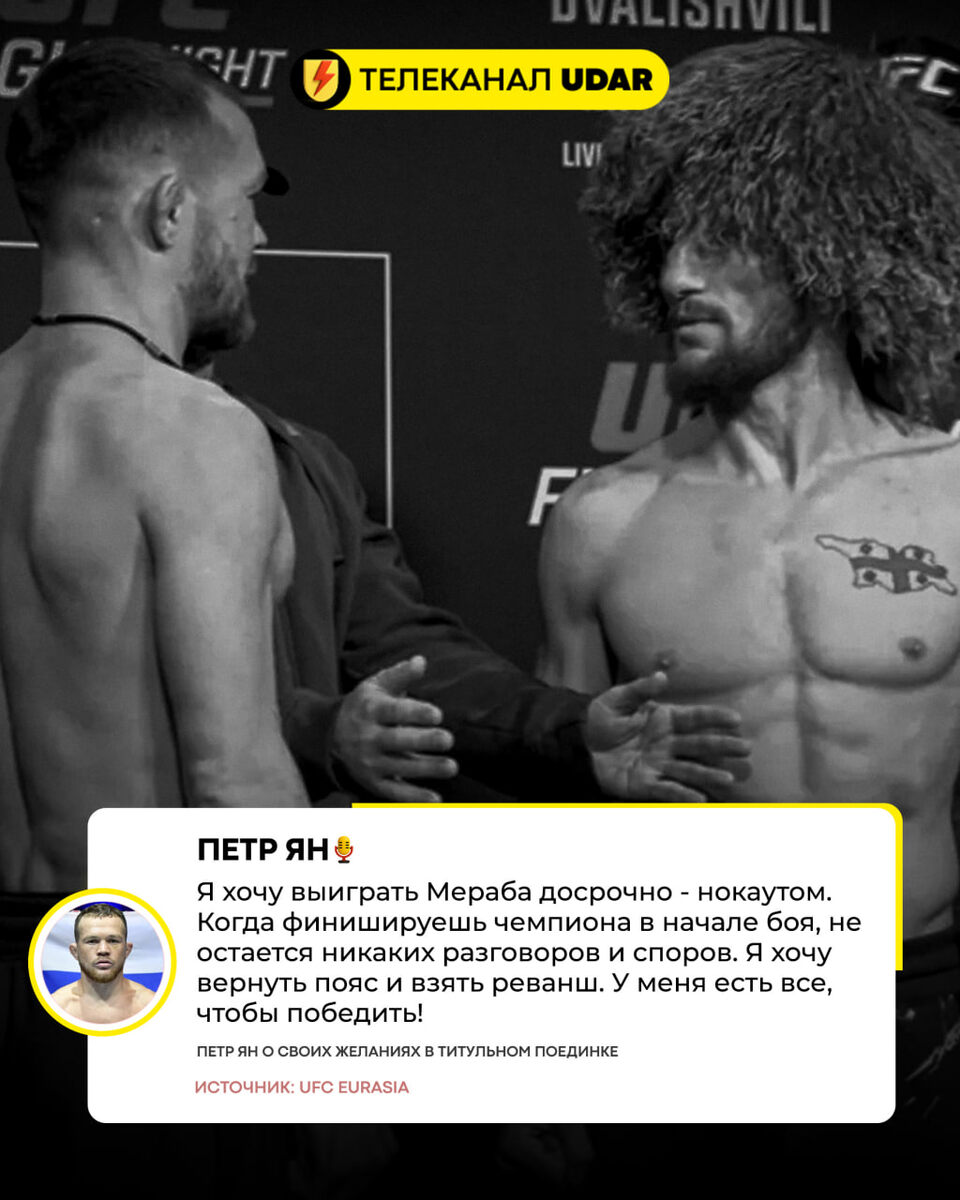 🥊😨Петр Ян нокаутирует Мераба Двалишвили в первом раунде. С таким прогнозом россиянин вышел к журналистам UFC, где четко объяснил, что хочет нокаутировать Мераба Двалишвили. 🎙️"Я хочу выиграть Мераба досрочно - нокаутом. Когда финишируешь чемпиона в начале боя, не остается никаких разговоров и споров. Я хочу вернуть пояс и взять реванш. У меня есть все, чтобы победить!" - сказал Петр Ян ❤️ - Я верю в победу Петра Яна; 🔥 - Думаю, что Мераб Двалишвили сильнее 👍Поддержи наш канал cвоим голосом 📺Смотрим бои в прямом эфире ⚡ @teleudar