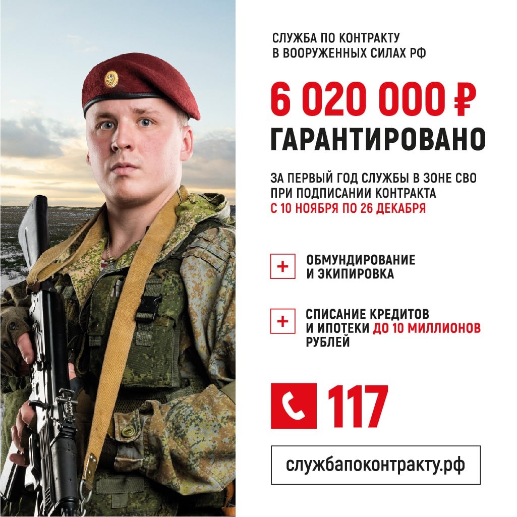 🖌Служба по контракту Поступить на военную службу по контракту можно на Госуслугах, в пункте отбора или военном комиссариате. Требование Возраст — от 18 лет Состояние здоровья — определят на медосмотре в военном комиссариате Подробнее можно узнать на сайте службапоконтракту.рф и тел. 117 ____________________________________________________________ 🌐 Сайт | 📱 Тelegram | 📱 ВК |📲 ОК