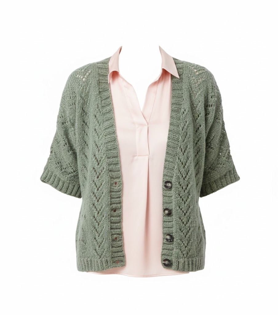 - 5-й ряд: Вязать 1 (3) 1 (3) 2 лиц., затем [2 п. вместе лиц., накид, 3 лиц.] 0 (0) 1 (1) 0 раз, [накид, 1 п. снять, 1 лиц., протянуть снятую, 1 лиц.] 1 (1) 1 (1) 0 раз, * 4 лиц., 2 п. вместе лиц., накид, 3 лиц., накид, 1 п. снять, 1 лиц., протянуть снятую, 1 лиц. *, повторять от * до последних 7 (9) 0 (2) 5 п., затем [4 лиц., 2 п. вместе лиц., накид] 1 (1) 0 (0) 0 раз, 1 (3) 0 (2) 5 лиц.