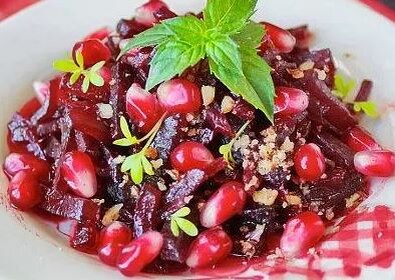 Ингредиенты: - 500 г свеклы - 4 граната (для сока) - 2 головки репчатого лука - 2 веточки петрушки - 0,5 стакана зерна граната Приготовление: Свеклу вымыть, испечь, очистить и мелко натереть, соединить с соком граната, чтобы получилась масса средней густоты, добавить очень мелконарезанный лук, зелень, соль, все хорошо перемешать и посыпать зернами граната.