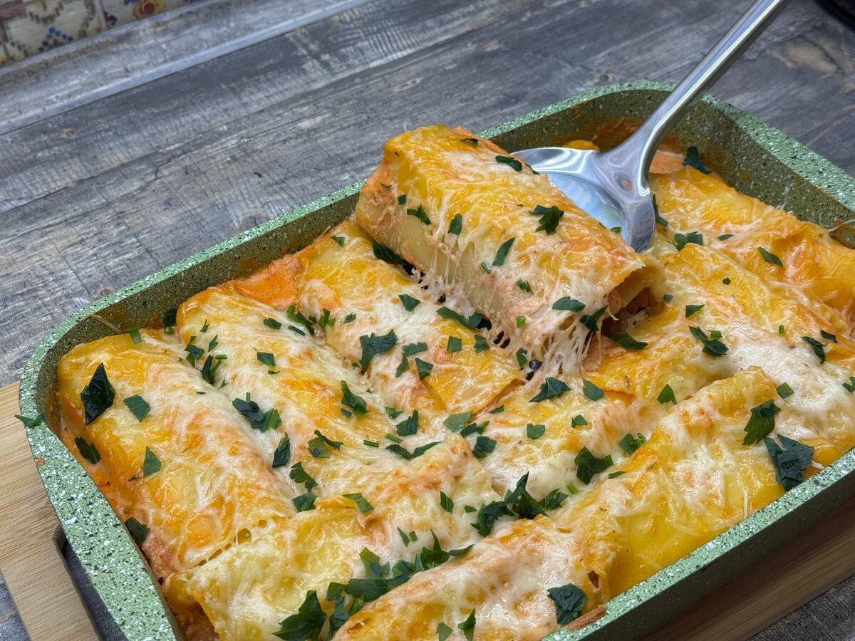 Этот рецепт — моя любимая альтернатива классической лазанье. Вместо привычных слоёв я заворачиваю фарш в листы пасты и получаю аккуратные рулетики, которые красиво смотрятся на столе и отлично держат форму. Блюдо получается нежным, сочным и очень ароматным благодаря тому, что рулетики запекаются в густом сливочно-сметано-томатном соусе. Он пропитывает пасту, делает начинку мягкой, а сверху образует лёгкую румяную корочку. В миске соединяю куриный и индюшиный фарш. Мелко рублю лук, давлю чеснок, добавляю в фарш. Солю, перчу, всыпаю паприку и итальянские травы. Хорошо перемешиваю. Совет: фарш станет гораздо нежнее, если дополнительно ввести 2–3 ст. л. ледяной воды — текстура станет более воздушной. Если использую листы, которые нужно варить — опускаю их в кипящую воду на 4–5 минут до мягкости, но не до полной готовности. Выкладываю на полотенце, чтобы подсохли. Если листы для запекания, просто держу их под рукой. Совет: не переваривайте листы — слишком мягкие будут рваться при скручиван