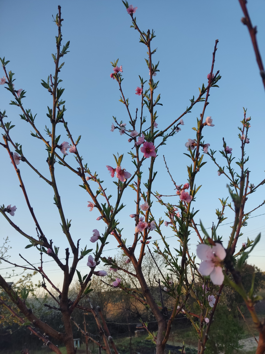 Персик нам достался от старых хозяев. До этого мы ни разу не видели даже как он цветёт. В этом году персик нас удивил. Зацвел. Красиво. Это был апрель. А потом был май, с его возвратными заморозками. Все фрукты побило заморозками, включая персик. В июле (или августе) муж разглядел один персик. Неожиданно оказалось, что один плод все таки завязался. Съели мы его напополам с соседкой. Очень вкусный и сочный. Надеюсь персик ещё порадует нас.