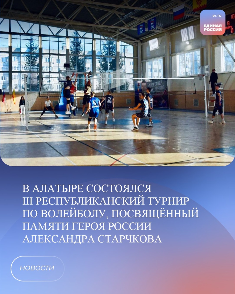 В Алатыре прошел III Республиканский турнир по волейболу, посвящённый памяти Героя России Александра Ивановича Старчкова. В турнире приняли 16 команд из 7 муниципалитетов и трёх регионов — Нижегородской области, Республики Мордовия и Чувашской Республики. Участников соревнования поприветствовали депутат Госсовета Чувашии Евгений Таланов и заместитель председателя «Молодой Гвардии» по региональной политике Андрей Шакулов. #ЕР21 #ЕРЧувашия
