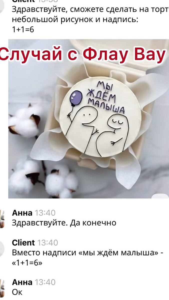 Вся история будет понятной из скриншотов. Обратилась заказчица с запросом на торт, отправила такое задание. Нужно было сделать небольшой рисунок на бенто-торте и надпись "1+1=6" вместо надписи "Мы ждем малыша". В описании к заказу было обозначено, что нужен рисунок как на референсе, в начинке ваниль-клубника, а крем должен быть розовым. О том, что крем розовым должен быть ВНУТРИ торта - не было ни слова. Я приняла такой заказ (на свою голову). Сделала милый розовый бенто-торт. Но когда отправила его заказчице, меня ждала ее неординарная реакция. Девушка сказала, что розовый крем внутри- это же очевидно, это же гендер-пати! Но как по мне, очевидно это было только для нее)) Нигде она этот факт не проговорила, не прописала...А я следовала четко по ее указаниям. Чтобы переделать торт, нужно было отменять курьера, так как он уже был в пути. Написала в поддержку, отменила..Переделала торт. Хотя, честно? Можно было бы не переделывать, и правда была бы за мной. Вот тако