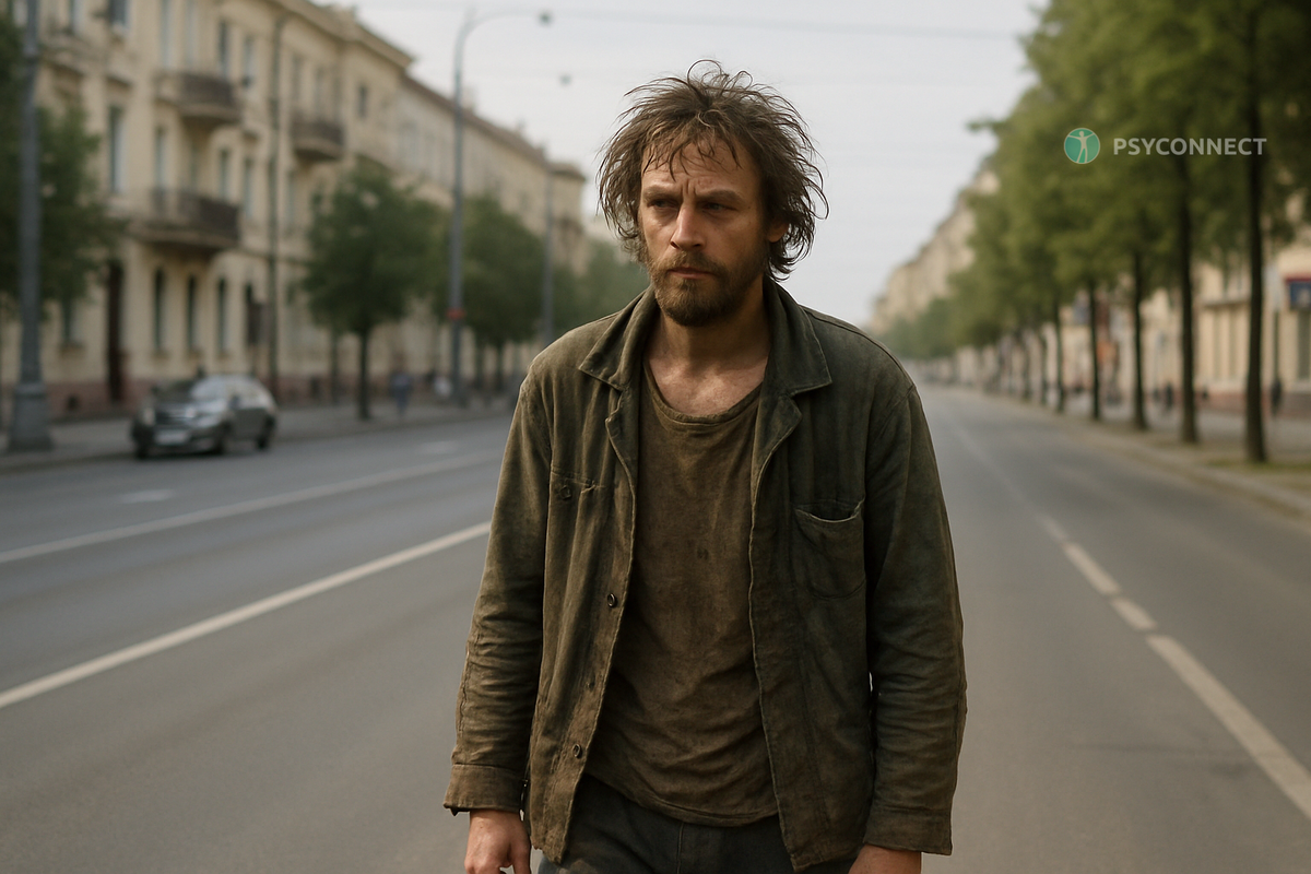 Его видят на углу проспекта. Стоит, бормочет что-то себе под нос. Вдруг хохочет — будто услышал шутку, понятную только ему. Волосы сбились в колтуны. Одежда порвана. Взгляд — пустой и в то же время напряжённый, как у человека, который видит слишком много сразу. Люди обходят его стороной, как мину. А его зовут Андрей. И каких-то двадцать лет назад он был мальчиком, который обожал динозавров и рисовал семью, где все держатся за руки.