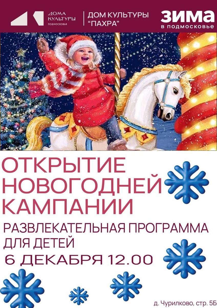 ✨ ❄️ Встречаем зиму весело! Детей ждёт увлекательная игровая программа 🎈 и творческие мастер-классы 🎨. Ждём всех на праздник! ☃️✨ 📆 06.12.2025🕒12:00 🏢 Сельский дом культуры (СДК) «Пахра» 📍 г.о.Домодедово, дер.Чурилково, ул.Чурилково, д.5Б ✅ Мероприятия Домодедово https://dzen.ru/id/66f10385cc4c5a16f7b5fb02 http://vk.com/domodedovo_events http://dzen.ru/domodedovo_events