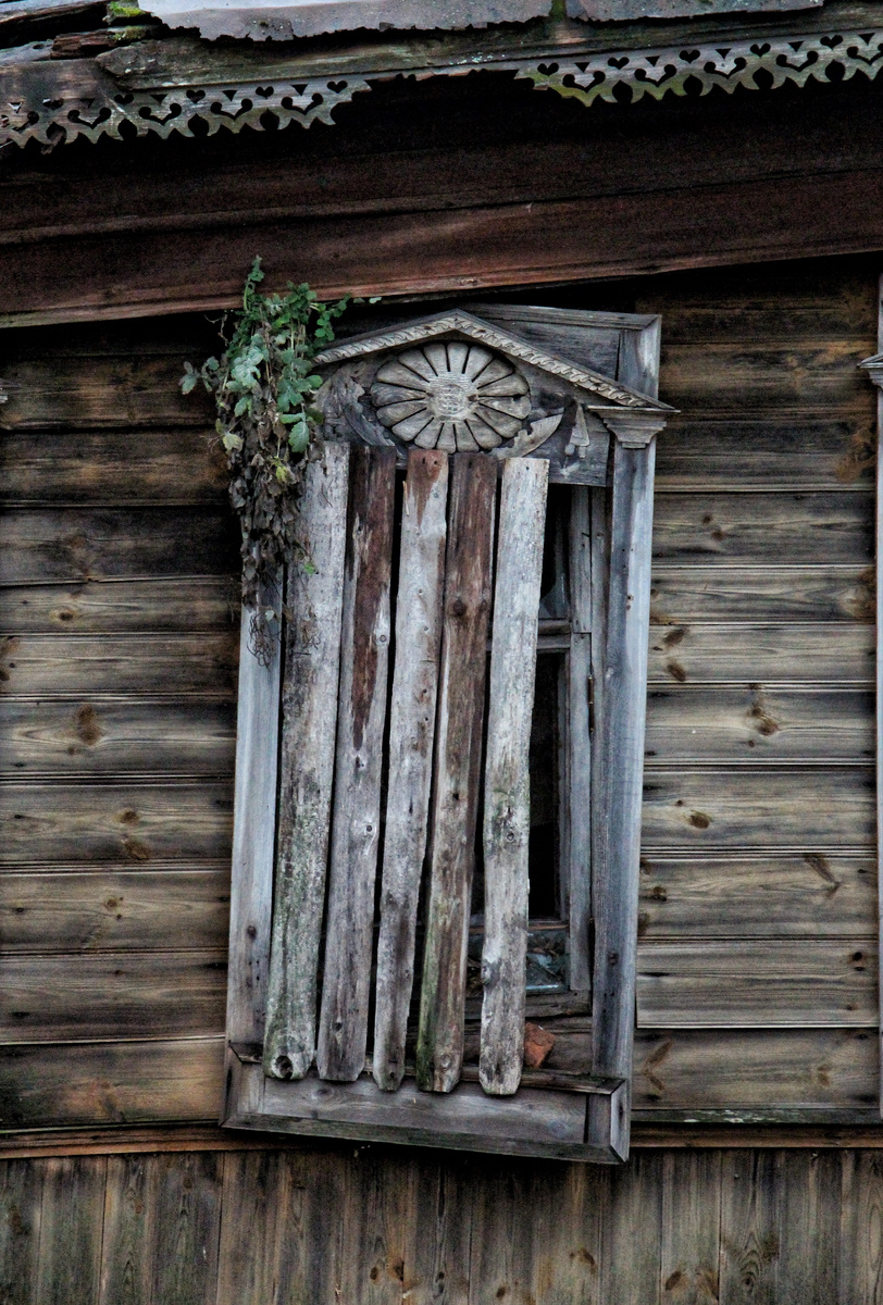 Совершенно очаровательный вид русской глубинки претерпел значительные изменения. Дело тут, конечно, не в какой-то конкретной причине. Скорей, обстоятельств, послуживших этому, превеликое множество, и перечислять их можно до бесконечности. Закончив фотосъемку храмового комплекса с.Хотимль, захотелось прокатиться и по окрестностям. Мир не без добрых людей, направили меня добрым словом по соседним деревням, а там… а там наличники! Да такие, что есть желание «это удовольствие» растянуть на несколько публикаций. Нещадно лил дождь, что, к слову, видно на некоторых фото. До кучи меня обдуло всеми ветрами. Всё как я люблю!) Не… меня так просто не выпроводить) Позвольте, я поделюсь с Вами историей одного снимка. Обратите внимание на первое и второе фото. Привлекло меня заколоченное окно заброшенного деревянного здания. Именно здания, так как на жилой дом оно было не похоже. Слишком большое, угловатое. Может, контора? Может, еще что? Внешне… тем более, сейчас, оно ну совершенно не примечат
