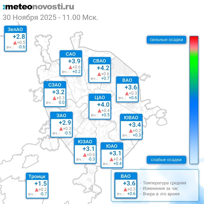 В 11:00 в Москве было от +2.1°C до +4.3°C, средняя температура +3.5°C #погода #Москва #осень #температура #30ноября #воскресенье