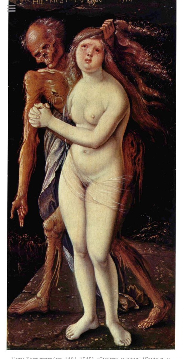 Похожая сцена изображена на более поздней картине Бальдунга «Смерть и дева», также более точно названной «Смерть и похоть» (1517). На этот раз Смерть крепко держит женщину за локоны, и она складывает руки в молитве, прекрасно понимая, какая участь её ждёт. Когда к этой теме вновь обратились во второй половине XIX века, образы изменились. Смерть уже не была мрачным дохристианским жнецом, а представляла собой Ангела Смерти с оперёнными крыльями. #символы_в_искусстве