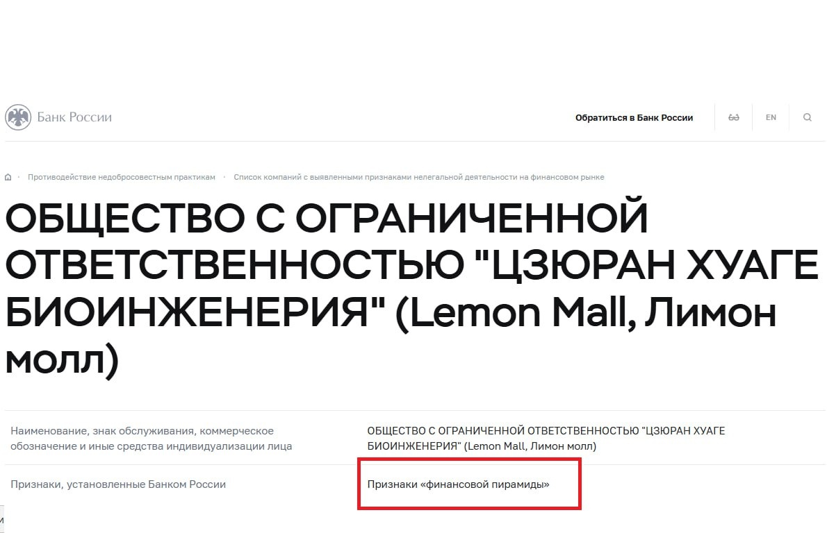 Банк России предупредил красноярцев о рисках инвестирования в Лимон молл Банк России выявил признаки финансовой пирамиды в деятельности ООО «ЦЗЮРАН ХУАГЕ БИОИНЖЕНЕРИЯ» (Lemon Mall, Лимон молл). Информация об этом внесена 17 ноября 2025 года в предупредительный список Банка России. Легендой проекта является заработок на инвестициях в деятельность компании «Хуагэ», создающую маркетплейс «Lemon Mall», построенный по принципу сетевого маркетинга. Признаки финансовой пирамиды: - организация деятельности на принципах сетевого маркетинга - предусмотрены предварительные (специальные) взносы - компания зарегистрирована за несколько месяцев до начала активной деятельности, имеет единственного учредителя и руководителя - компания не может подтвердить свою деятельность (направления размещения привлеченных денег, информация об их размещении) Фото: Банк России 🤩Новости Сибири | Прислать новость