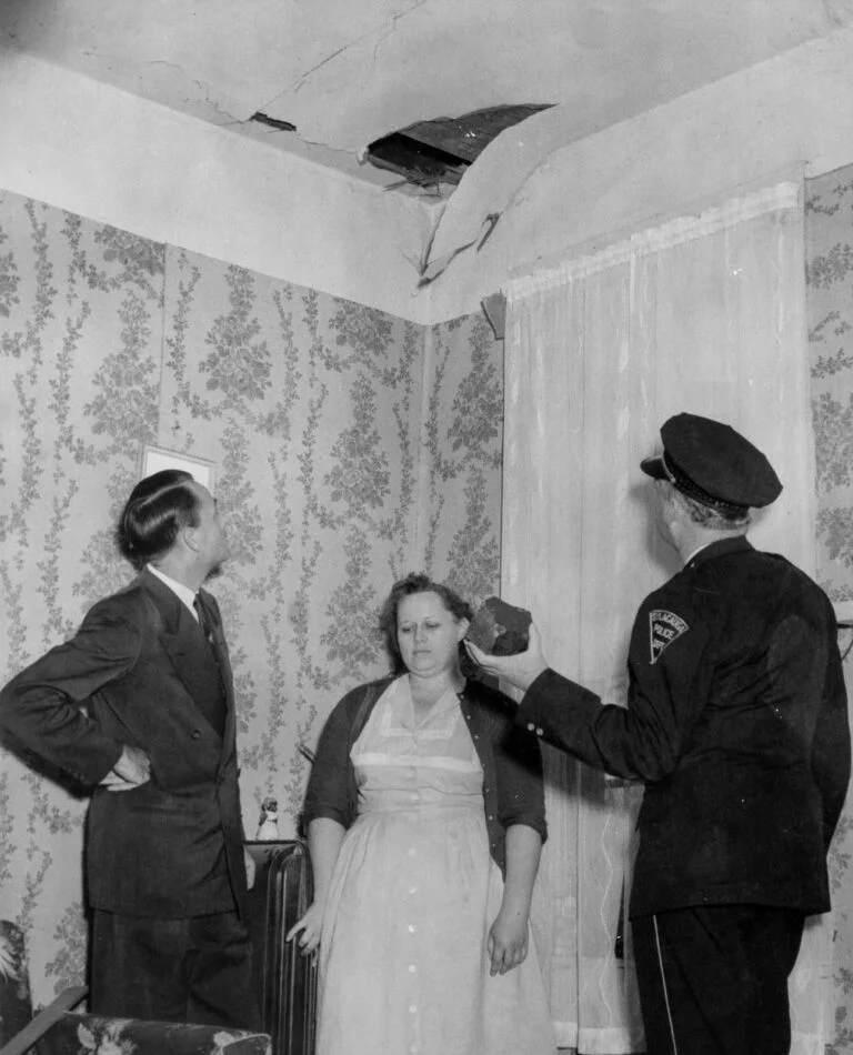 Удар был такой силы, что Энн подбросило. Она проснулась в облаке пыли и штукатурки, ничего не понимая. Бок пронзила боль. Мать Энн, которая была в доме, выбежала на шум. Первая мысль — неисправность обогревателя. Вторая — обрушение трубы. И только когда пыль осела, женщины увидели дыру в потолке и странный черный камень на полу.
