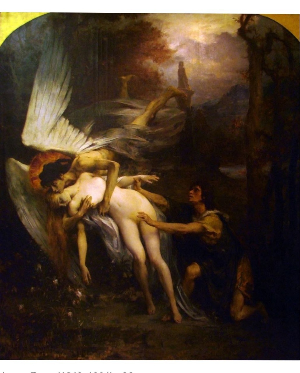 Стиль Анри Леви, возможно, более академичен и традиционен, чем у Мунка, но его « Молодая женщина и смерть» 1900 года вызывает почти столько же эмоций. Ангел Смерти, изображённый в виде благочестивого юноши с большими белыми крыльями, обнимает умирающую девушку с откровенно эротичным видом, прижимая руку к груди и поднося губы к её уху. Она совершенно обнажена, а одетый юноша стоит на коленях рядом с ней, протягивая руки и умоляя ангела оставить её с ним. Позади — «готический» пейзаж. Однако « Смерть и дева» Марианны Стоукс ( 1908) возвращает нас к чистоте Верне. Её Ангел Смерти может быть даже женщиной: в правой руке она держит фонарь, утешая свою юную жертву. (Смотрите предыдущий пост). #символы_в_искусстве