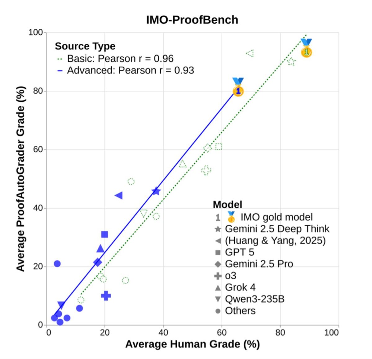 🚀 Big news from Google DeepMind! They've dropped IMO-Bench, a new set of tests pushing AI math skills to International Math Olympiad (IMO) levels! 🧮💡 Here’s what’s in the mix: • IMO-AnswerBench: 400 short-answer problems • IMO-ProofBench: 60 proof-writing challenges • IMO-GradingBench: 1,000 ready-to-check proofs for automatic grading The game-changer? It’s not just about getting the right answers anymore. We’re talking deep reasoning, logical chains, and rigorous proofs—just like the math Olympians! 🏅🧠 Results are in: Gemini Deep Think scored: • 80.0% on AnswerBench • 65.7% on ProofBench That’s gold medal territory at the IMO—way ahead of GPT-5 and Grok-4! 🥇📈 #MathNerds #AIFuture