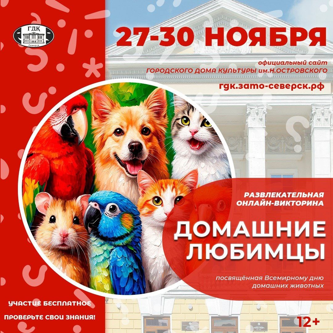 Онлайн-викторина «Домашние любимцы»! Всемирный день домашних животных отмечается ежегодно 30 ноября. Он посвящен всем одомашненным человеком животным и служит напоминанием всему человечеству об ответственности за «братьев наших меньших». К этому событию подготовили викторину, где вы сможете проверить свои знания о домашних животных. Викторина доступна к прохождению на сайте https://гдк.зато-северск.рф/razvlekatelnaja-onlajn-viktorina-domashnie-ljubimtsy https://гдк.зато-северск.рф/razvlekatelnaja-onlajn-viktorina-domashnie-ljubimtsy
