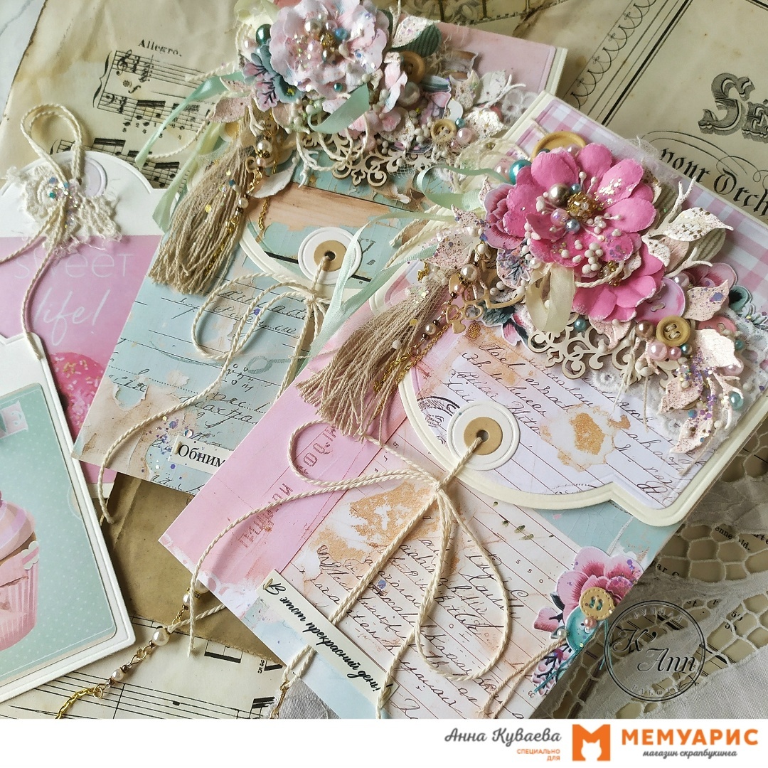 Среди таких материалов оказался и чипборд, и бусины, которыми я щедро украсила большие цветы! Но и новенькое конечно есть в моих конвертах - это шикарный набор бумаги 15х20см Mintay papers "In My Craftroom" на рукодельную тему, в сочетании со старенькой Примой материалы получили новую жизнь!
