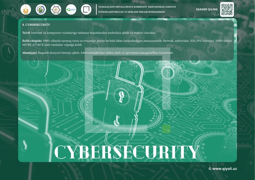 🔥 Cybersecurity Kiberxavfsizlik (Cybersecurity) – kelib chiqishi, xalqaro qoʻllanilishi va afzalliklari 🔍 KIBERXAVFSIZLIK NIMA? Kiberxavfsizlik – bu axborot texnologiyalari (IT) tizimlari, tarmoqlar, qurilmalar va maʼlumotlarni zararli hujumlar, noqonuniy kirishlar, oʻzgartirish, oʻgʻirlash yoki yoʻq qilishdan himoya qilishga qaratilgan ilmiy-texnik choralar majmuasidir. Bugungi raqamli dunyoda kiberxavfsizlik insonlar, tashkilotlar va davlatlar uchun strategik zaruratga aylangan. 🕰 KELIB CHIQISH TARIXI… ✍️ Muallif: Abdussalomjon ✍️ Kategoriya: #Blog 📌 Turi: post 🔗 Batafsil o‘qish: https://qiyali.uz/cybersecurity/