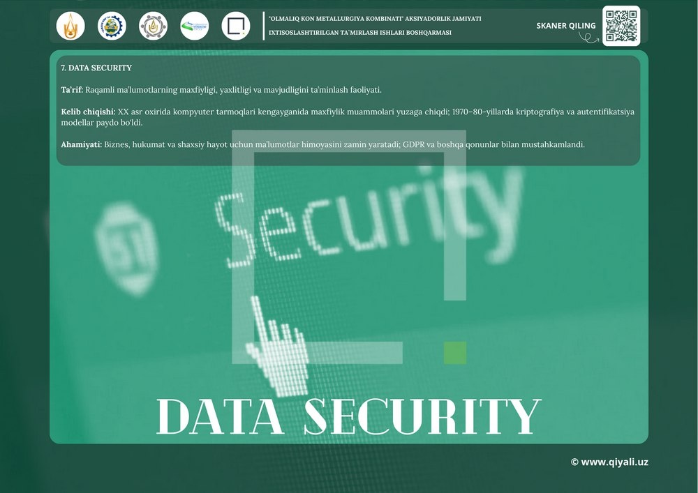 🔥 DATA SECURITY DATA SECURITY — MA’LUMOTLAR XAVFSIZLIGI: TARIXIY IJOD, GLOBAL AMALIYOT VA STRATEGIK AHAMIYATI 🔐 Kirish Bugungi raqamli asrda ma’lumot – bu nafaqat boylik, balki qudrat hamdir. “Kimda ma’lumot bor – o‘shanda kuch bor” degan ibora hech qachon bunchalik dolzarb bo‘lmagan. Ayniqsa, kompaniyalar, davlat muassasalari, shaxsiy foydalanuvchilar, moliyaviy institutlar va sanoat korxonalari uchun Data Security… ✍️ Muallif: Abdussalomjon ✍️ Kategoriya: #Blog 📌 Turi: post 🔗 Batafsil o‘qish: https://qiyali.uz/data-security/