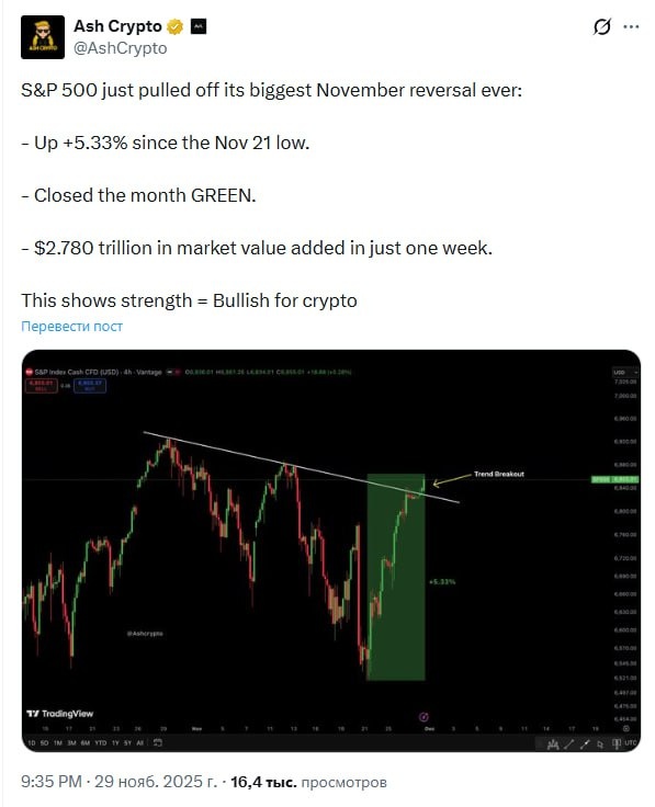 Индекс S&P 500 совершил самый мощный ноябрьский разворот в своей истории: С минимума 21 ноября вырос на +5,33%. Закрыл месяц в плюсе. За одну неделю рыночная капитализация выросла на $2,780 трлн. Это говорит о силе рынка = Позитивный сигнал для криптовалют.