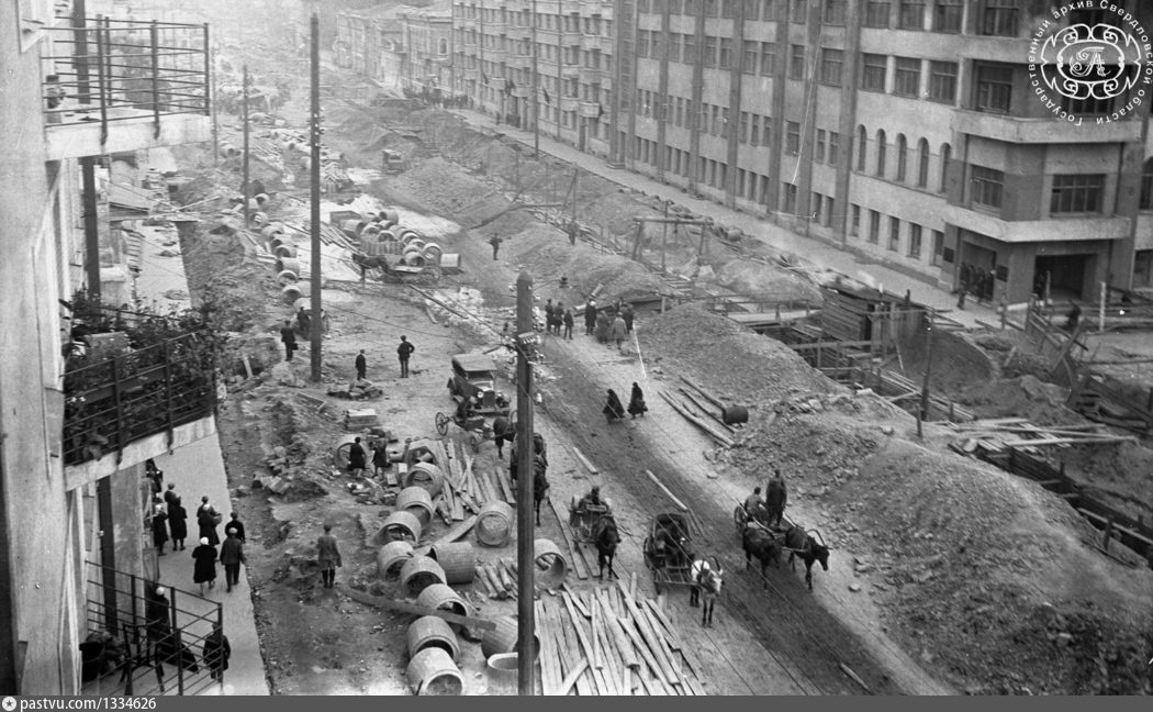 День добрый! Сегодня классическое - "раскопали тут!". Снимок выполнен в 1931 году во время строительства здания ОблИсполКома в Свердловске, в оригинале и сейчас- Екатеринбург. Ремонт или прокладка канализации на существующей улице это всегда стресс и ужас для всех... просто разной степени тяжести. На снимках можно увидеть то, как была раскопана улица Пушкина. Как видим дорога в этом случае делилась на три части- траншею, склад под материалы и собственно саму дорогу. С одной стороны можно увидеть выкопанную траншею с уже завершенной дощатой опалубкой для защиты от обрушения откосов и отвал грунта рядом для обратной засыпки. Следствие этого - штабеля досок вдоль всего участка, так как после того как одна часть траншеи засыпается, доски начинают медленно, но верно мигрировать к следующему участку. В проекте предусматривались колодца из бетонных колец, они доставлялись и выгружались вдоль траншей недалеко от места будущего монтажа. Труб на снимках не видно, скорее всего они на этом участ