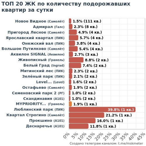 📈 Рост цен в: 31 ЖК (183 кв.) 🏆 ЛИДЕРЫ ПО РОСТУ: ПИК 9 ЖК 17кв +7,8% Самолёт 6 ЖК 136кв +7,0% A101 3 ЖК 4кв +9,6% Гранель 3 ЖК 4кв +5,4% Ingrad 2 ЖК 3кв +5,7% Sminex 1 ЖК 1кв +6,5% FORMA 1 ЖК 1кв +1,0% Галс 1 ЖК 8кв +2,3% Аквилон 1 ЖК 3кв +2,7% РГ 1 ЖК 2кв +1,0% 👇 Полная статистика: 📲 В Telegram — быстро посмотреть 🌐 На MskMeter.ru — графики цен и скидки за любой период