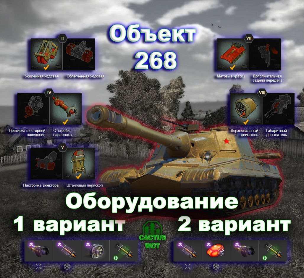 ➿Объект 268 🛕ПТ-САУ универсальная 10 уровень. СССР. ⛏Оборудование и полевая модернизация на картинке🔼 ➕Плюсы танка 📈точность орудия - хорошая; 📈мобильность на уровне ; 📈обтекаемый корпус, усиленный экранами; 📈боекомплект большой; 📈силуэт не высокий; 📈отличное пробитие ББ снарядами; 📈одно из лучших пробитий в мире танков кумулятивом. ➖Минусы танка 📉бронирование корпуса не очень; 📉углы горизонтальной наводки малые; 📉углы вертикальной наводки малые; 📉командирская башенка легко пробивается; 📉маскировки после выстрела нет. ⬇️⬇️⬇️⬇️⬇️⬇️⬇️⬇️ #базазнаний@CactusWOT #Объект268@CactusWOT #миртанков