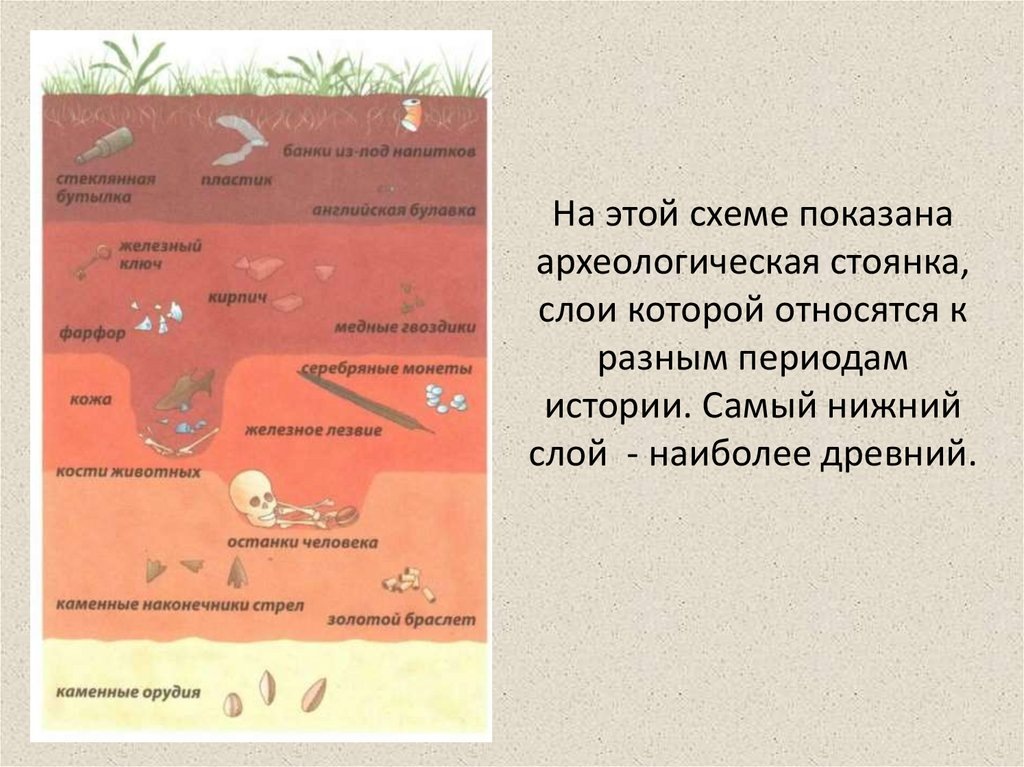 Определение культурного слоя. Культурный слой – это слой почвы (земли, грунта), с явными включениями материальных следов жизнедеятельности человека. Чаще всего возникает в местах более-менее оседлого проживания людей (поселения, городища). Может, как выходить на поверхность, так и, если поселение исчезло очень давно, находиться под толстым слоем пустого грунта. Культурный слой включает в себя: - фрагменты предметов быта, - керамики, - остатки костей домашних животных, - остатки кострищ и хозяйственных ям, - руины строений, - жилищ или крепостей. Хотя, строго говоря, культурный слой образуется не только в местах оседлого проживания человека. Скажем, если на каком-то месте в XVIII веке располагался придорожный кабак, то, что от него осталось в земле, сегодня тоже будет именоваться "культурным слоем" Культурный слой растёт со временем под воздействием многих факторов. Его толщина может быть разной от нескольких сантиметров, до десяти и более метров. На толщину культурного