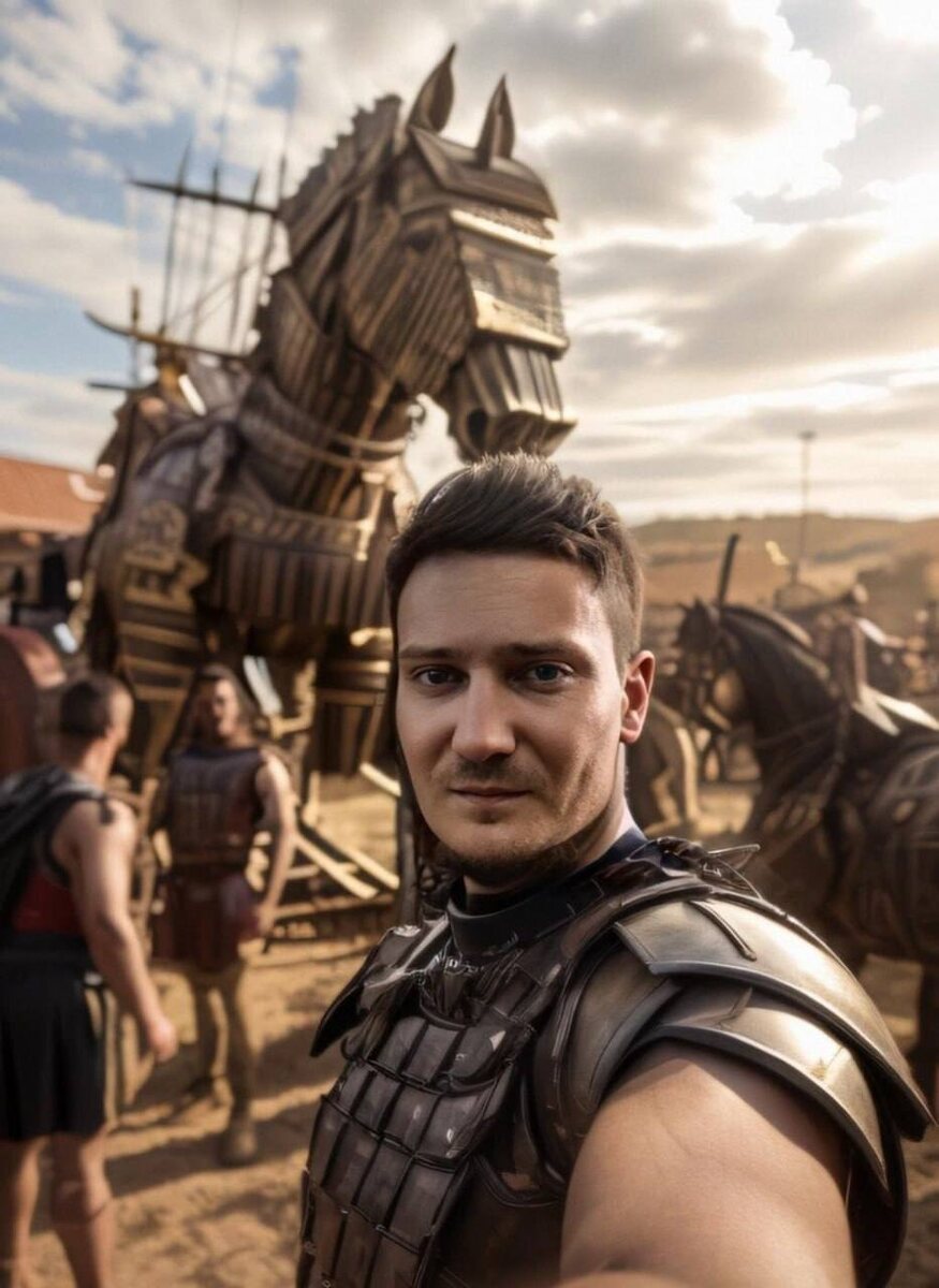С пацанами хитростью берем Трою в 1180 году до нашей эры🤳 селфи на фоне известного троянского коня. Для тех кто скажет, что это фотошоп поясняю: фотошоп появился только в 1990 году, так что это чистейшая правда 😊 #ии