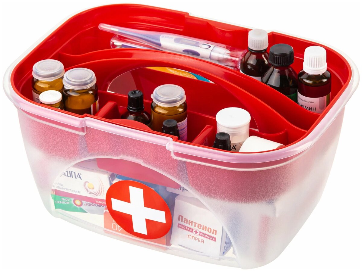 Подойдёт закрытый шкаф на кухне (но не над плитой) или в коридоре. Классический вариант — пластиковый контейнер с плотной крышкой, подписанный крупно: АПТЕЧКА. ОСТОРОЖНО!