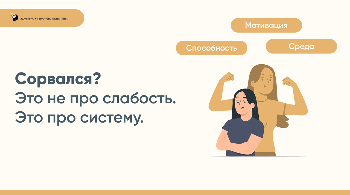 (иногда проблема не в вас, а в технологии) Многие стыдятся неудачных попыток бросить вредную привычку и списывают их на свой слабый характер. После нескольких попыток разочаровываются в себе. Но проблема обычно не в вас, а в неверной технологии изменения привычек. Базовая модель: действие = мотивация + способность + среда. Меняете компоненты — меняется поведение. Как применить модель к конкретной привычке: Иногда вы не верите, что не избавившись от этой вредной привычки, вы не справитесь. Я часто задаю своим клиентам вопрос: на сколько процентов из 100% вы верите, что не убрав эту привычку, вы не достигните желаемого.