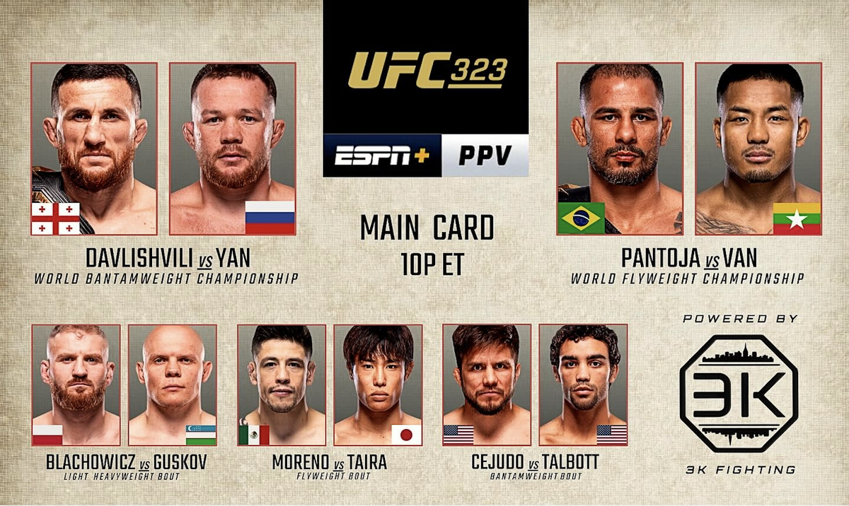 UFC 323, который пройдёт 6 декабря 2025 года в Лас-Вегасе, обещает стать одним из самых ожидаемых турниров года. В главном карде зрителей ждут титульные бои, реванши и противостояния топовых бойцов. Рассмотрим ключевые поединки и их возможные исходы. Первый бой между этими соперниками состоялся в марте 2023 года и завершился победой Двалишвили единогласным решением судей. Теперь Ян стремится вернуть пояс, а Двалишвили — защитить титул в четвёртый раз за год. Факторы в пользу Двалишвили: Шансы Яна: Прогноз: более детальная статистика и прогноз поединка в нашей статье Пантожа — действующий чемпион, который завоевал пояс в 2023 году. Ван — претендент с впечатляющей победной серией. Факторы в пользу Пантожа: Шансы Вана: Прогноз: более детальная статистика и прогноз поединка в нашей статье Блахович — бывший чемпион, а Гуськов — перспективный боец, стремящийся попасть в топ-5. Факторы в пользу Блаховича: Шансы Гуськова: Прогноз: более детальная статистика и прогноз поединка в нашей стать