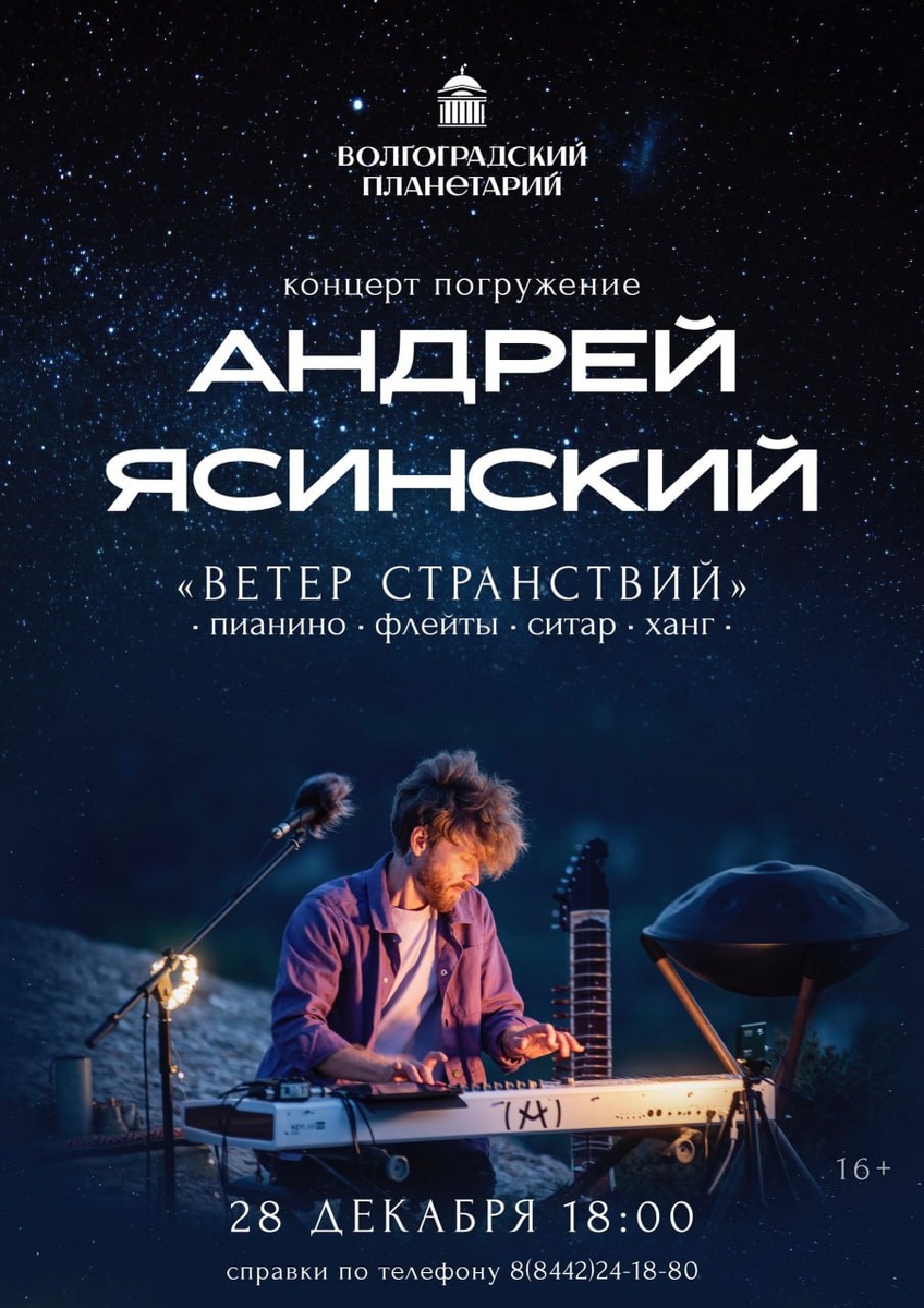 .......................................... КОНЦЕРТ-ПОГРУЖЕНИЕ "ВЕТЕР СТРАНСТВИЙ" #КонцертВпланетарии .......................................... Концерт Андрея Ясинского - это путешествие в мир спокойствия и внутреннего слияния со звукотишиной. Этот концерт - необычный опыт, где ритмы музыки переплетаются со звуками природы, создавая гармонию, которая завораживает и успокаивает душу. Вы погрузитесь в самые глубины своего сознания, где музыка становится мостом между нами и нашим внутренним "Я". Андрей будет вести вас через тихие и медитативные мелодии, приносящие любовь, покой и озарение. В этом музыкальном пространстве каждая нота и каждая пауза станут источником вдохновения и ясного созерцания! Фортепиано, ханг, равваст, флейты народов мира, окарина, индийский ситар и другие редкие инструменты в руках Андрея рождают совершенно неземную, космическую музыку, проникающую в душу, бережно раскрывающую каждое сердце. Храните дату и подготовьтесь к этой встрече со своим внутренним настро