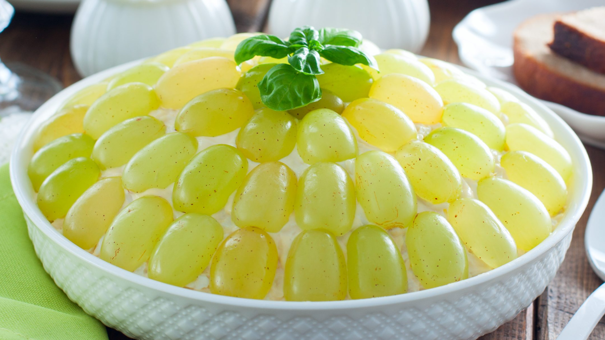 Салат "Тиффани" получил свое название благодаря внешнему оформлению — обычно его выкладывают в виде роскошного браслета или украшения, посыпая сверху виноградом, который напоминает драгоценные камни. В классическом варианте основными ингредиентами выступают куриное филе, сыр, яйца, грецкие орехи и виноград. Такой салат получается сытным, но при этом легким, а сладковатый вкус винограда прекрасно гармонирует с нежностью курицы и ореховой ноткой.