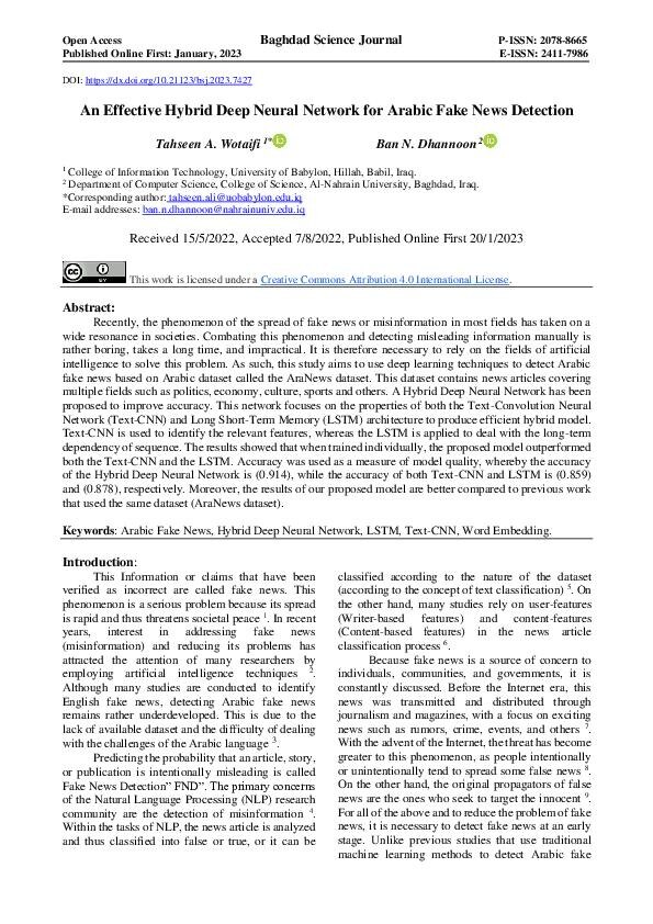 Широкое распространение Интернета привело к появлению множества вводящей в заблуждение информации, размещаемой на новостных сайтах и в социальных сетях. Многие авторы новостей и организации манипулируют данными, чтобы распространить ложную информацию на различных языках и в разных сообществах. Точная и своевременная идентификация фейковых новостей во многом осуществляется благодаря технологиям на основе машинного обучения. В данной статье рассматривается проблема выявления фейковых новостей на арабском языке с использованием моделей машинного обучения. Гибридная модель из двух глубоких нейронных сетей используется для классификации арабских новостных статей с целью выявления фальшивых материалов. Два типа нейронных сетей, используемых в модели, это сверточные сети и двунаправленные сети долгосрочной краткосрочной памяти. Надежные признаки извлекаются с помощью двух различных векторных представлений слов и сложной модели сверточной нейронной сети. Кроме того, набор вспомогательных выхо