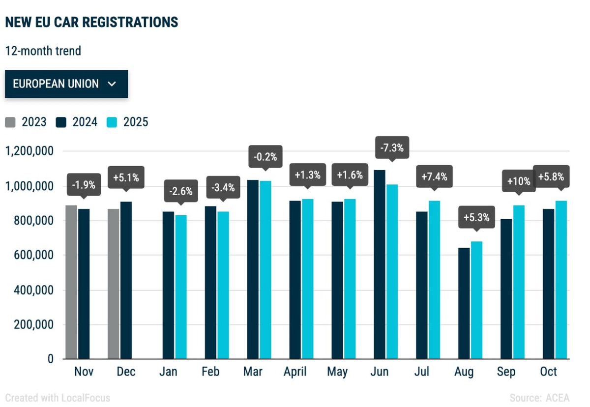 Регистрация новых автомобилей в ЕС: рост +1,4% по итогам января–октября